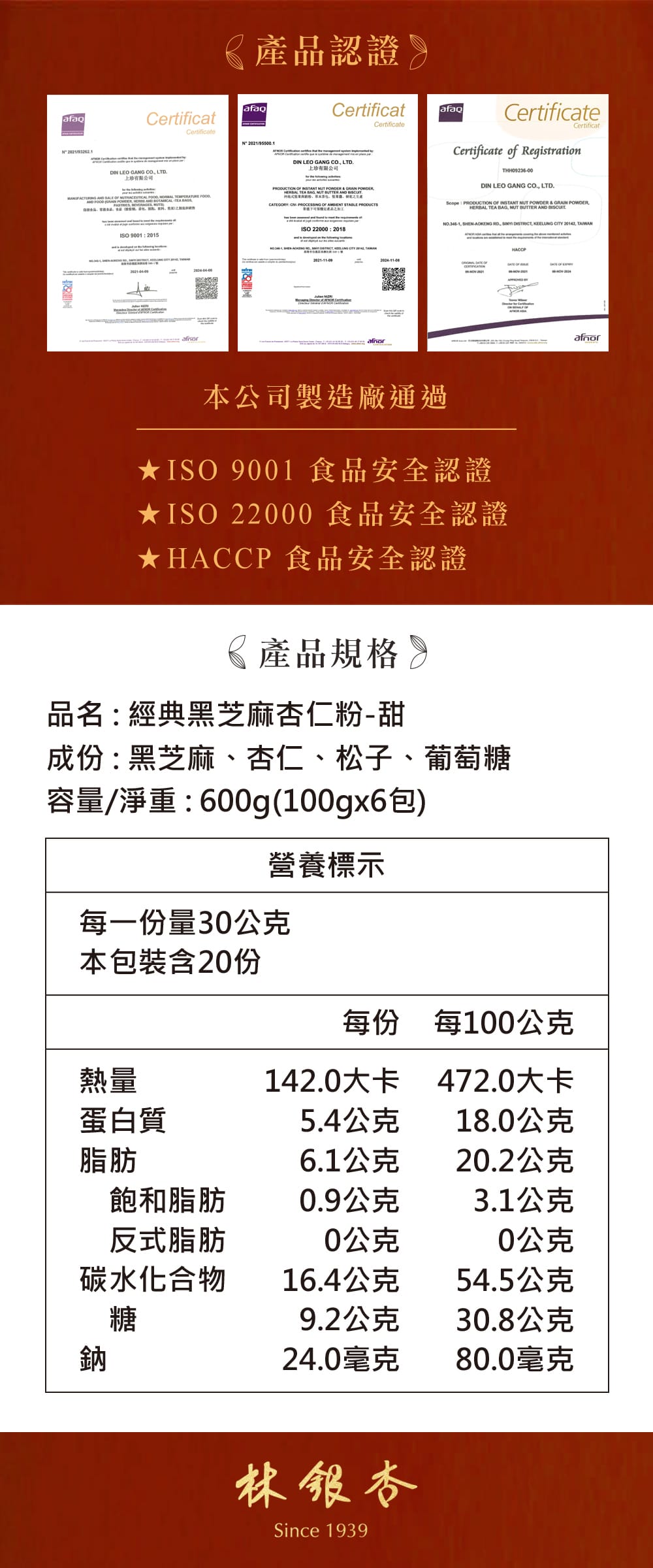 品名:經典黑芝麻杏仁(甜) 600g